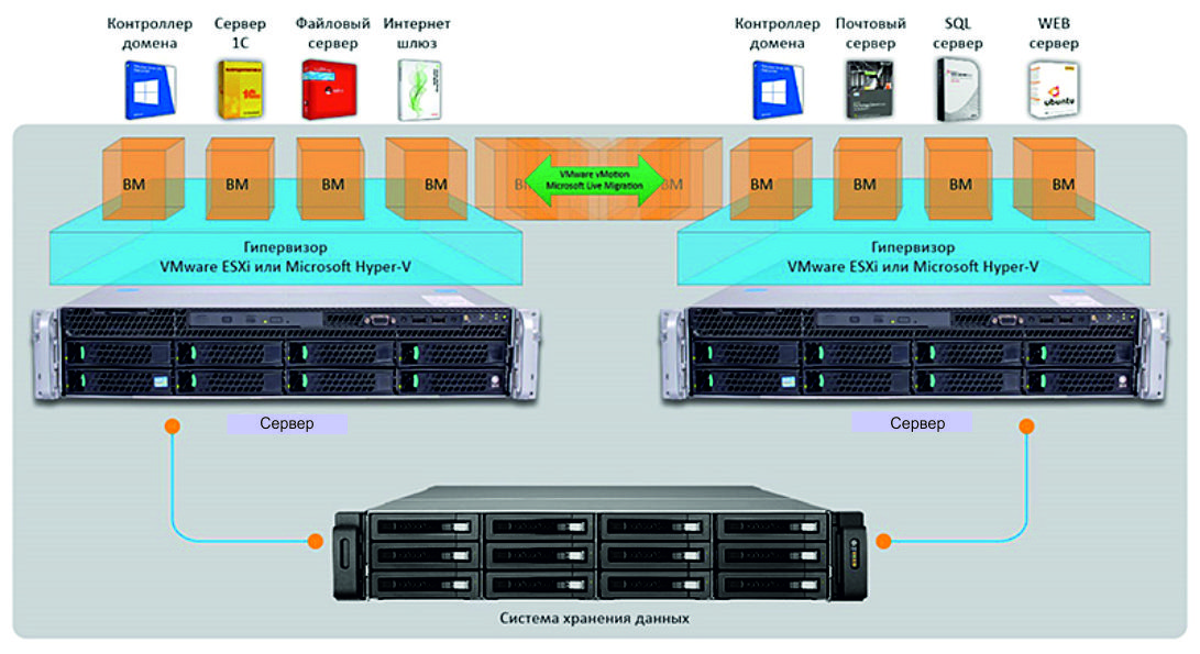 Дисковая подсистема – СХД виртуальных серверов используются для обеспечения доступа всех виртуальных машин в кластере. Также в виртуализации СХД используют для хранения образов виртуальных серверов для последующего быстрого восстановления работоспособности виртуальной среды в целом.